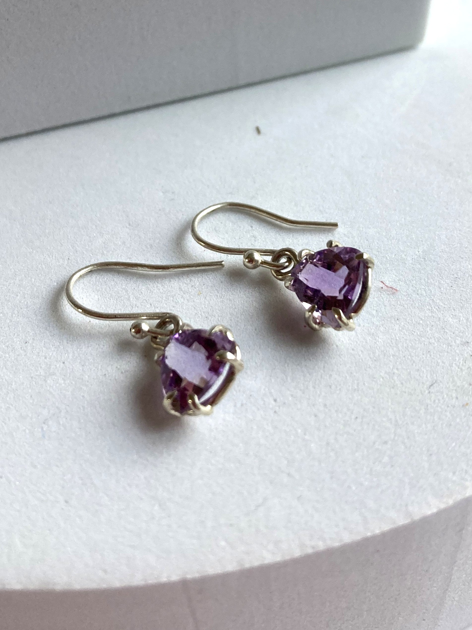 These handcrafted amethyst trillion earrings are a stunning piece of jewellery, featuring vibrant purple trillion-cut amethyst stones.