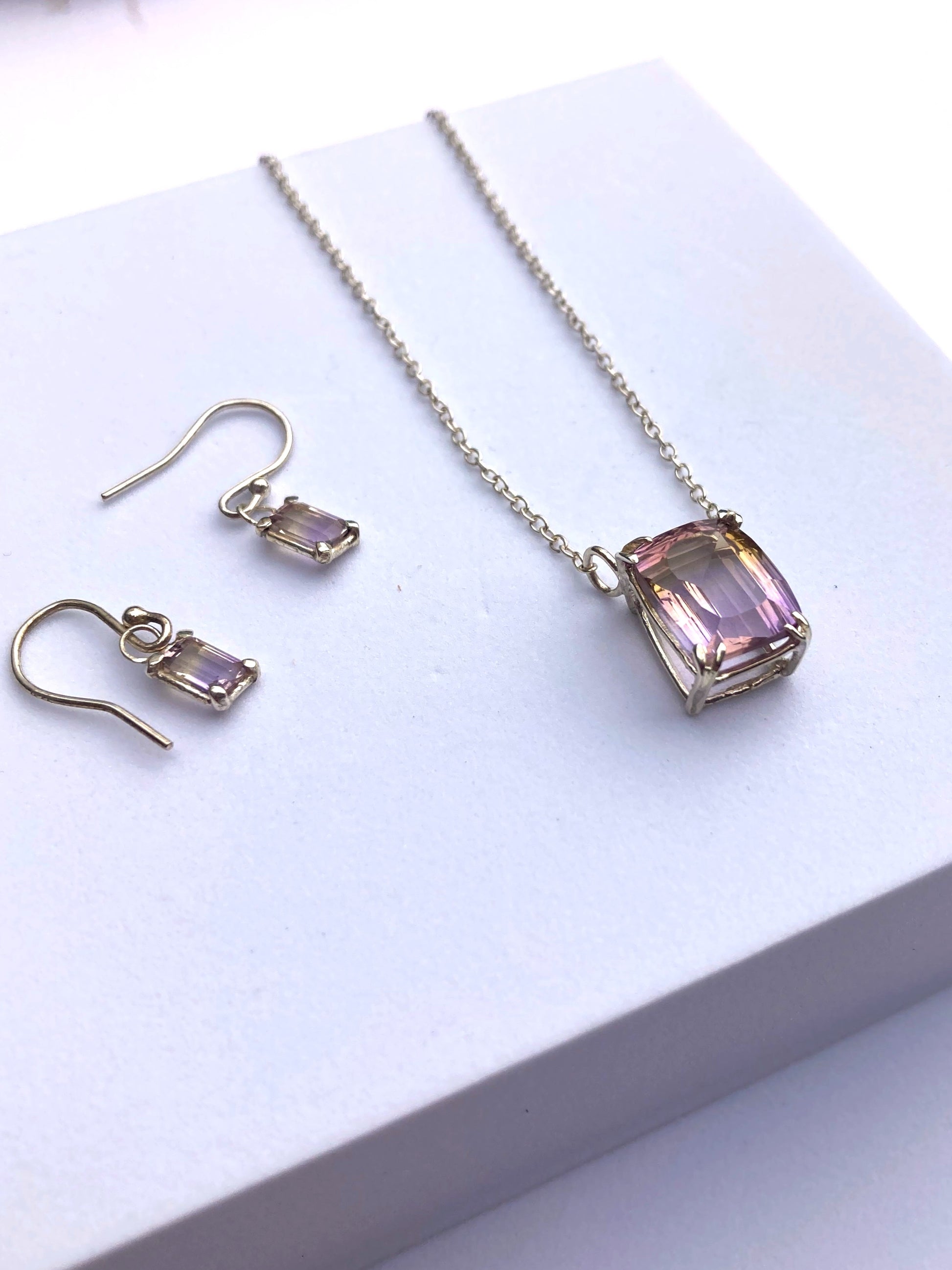 The ametrine gemstone is a natural marvel that combines the hues of amethyst (purple) and citrine (yellow). This creates a mesmerizing two-colour effect, with the stone displaying a gradient or split appearance of purple and yellow tones. The ametrine is cut into a rectangular or emerald-cut shape, which enhances its brilliance and allows the colours to be showcased beautifully.
